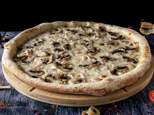 Сливочно-грибной вкус этой пиццы состоит из сливочного соуса, сыра моцарелла, пармезана, а также шампиньонов. Насыщенный и сочный вкус бекона придаёт пицце не только нежность, но и лёгкое послевкусие. (25 см)