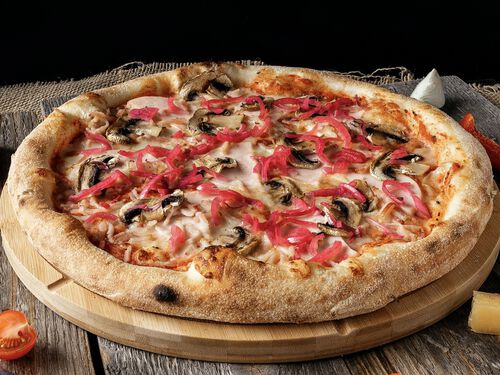 В этой пицце собралось идеальное комбо из ветчины, бекона, шампиньонов, томатного соуса и красного лука. Все это придаёт пицце неповторимый вкус и чуть сладковатое послевкусие. ( 30 см)