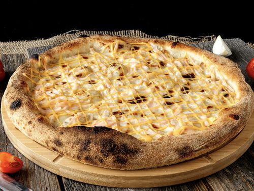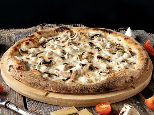 Классическое сочетание куриной буженины и шампиньонов прекрасно дополняется сыром моцарелла, пармезаном и сливочным соусом, а приятное послевкусие придает пицце чесночное масло. (30 см)