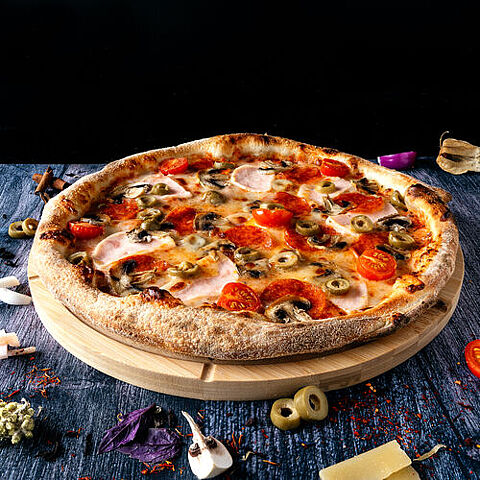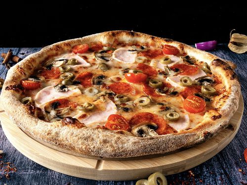Нежная ветчина, островатые колбаски пепперони, томаты черри, шампиньоны, оливки и сыр моцарелла отлично сочетаются между собой, придавая пицце незабываемый вкус средиземноморья. (25 см)