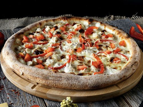 Томаты и болгарский перец отлично сочетаются с куриной бужениной и придают пицце больше сочности. А сливочный соус с сыром моцарелла придают пицце более сливочный вкус. Такое интересное сочетание никого не оставит равнодушным. ( 30 см)