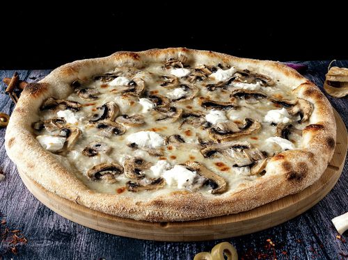 В основе этой пиццы сливочно-грибной вкус, который получается за счет сливочного соуса, шампиньонов, моцареллы и пармезана, а легкое послевкусие пицце придает чесночное масло( 25 см)