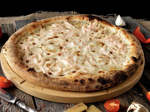 Насыщенный вкус ветчины, сыр моцарелла и сливочный соус прекрасно сочетаются в этой пицце с тающим во рту тестом. (30 см)